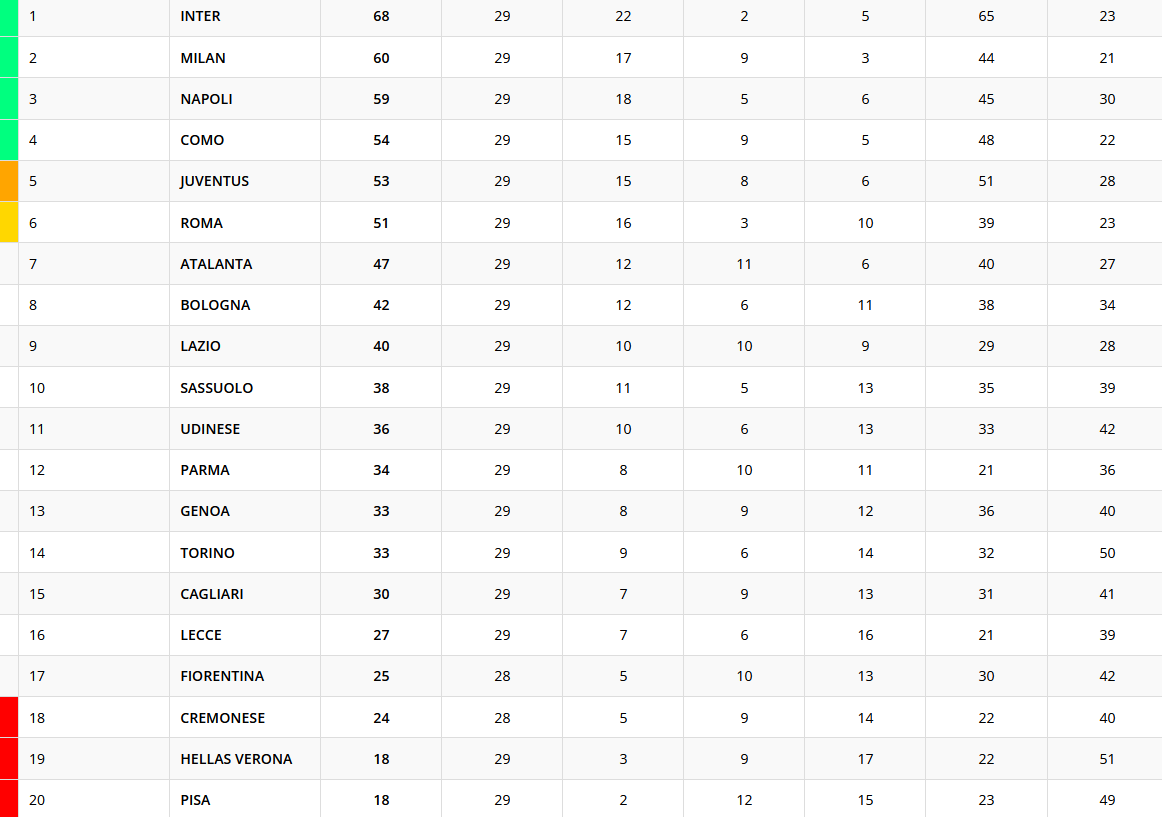 La Lazio vince contro il Milan, nel match valido per la 29esima giornata di Serie A. I biancocelesti si portano a quota 40 punti, mentre i rossoneri non approfittano del pari dell'Inter, scivolano a -8 dai nerazzurri e si ritrovano a una sola lunghezza sopra al Napoli. Ecco la classifica provvisoria della 29esima giornata di Serie A.