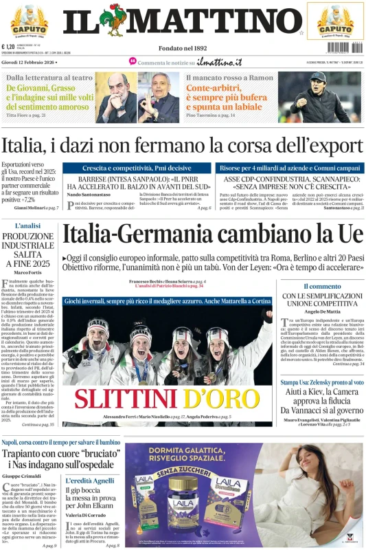 Di seguito le prime pagine dei principali quotidiani di giovedì 12 febbraio 2026.